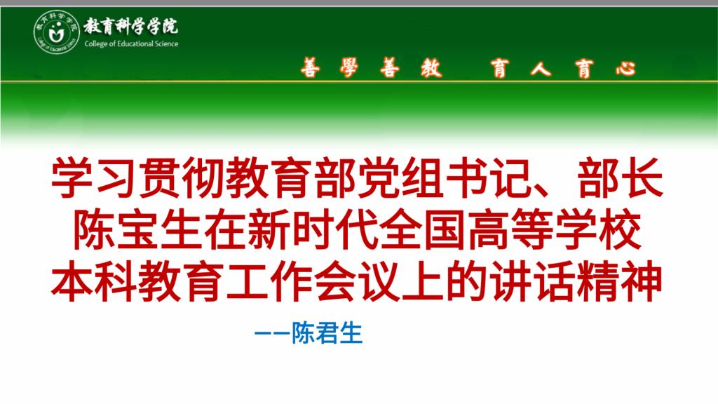 报告会上,陈书记首先介绍了本科教育工作会议概况。此次会议是2018年6月21日在成都四川大学召开,会议主题是:坚持以本为本,推进四个回归,建设中国特色、世界水平的一流本科教育。这是一次深入学习贯彻习近平新时代中国特色社会主义思想、全面部署高校落实立德树人根本任务的大会,是一次全面坚持以本为本,推进四个回归、建设一流本科教育的大会,也是一次全面高扬人才培养主旋律的大会。此次会议吹响了新时代振兴本科教育的号角,具有里程碑式的意义。其次学习传达了陈宝生部长讲话的主要精神。一是要深刻学习领会习近平新时代中国特色社会主义思想,牢牢把握高等公司的根本任务和根本标准;二是要坚持“以本为本”,推进“四个回归”,以本为本是由本科教育的本质属性、地位作用决定的,也是世界高等教育发展的共识和趋势,本科教育是大学的根和本。四个回归则是回归常识、回归本分、回归初心和回归梦想。三是要写好“奋进之笔”,建设高水平本科教育,内涵发展要深一些、领跑发展要快一些、公平发展要更实一些、变轨超车要更坚定一点。