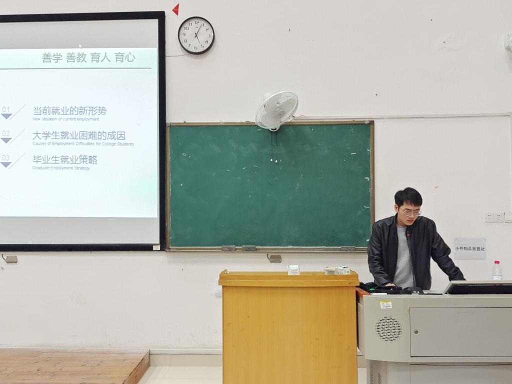 辅导员杨威老师通过分析目前岗位减少与毕业生人数增加的就业形势,提出同学们可改变求职方式,关注秋招和春招,走校招道路,制作简洁精确,美观规范的简历的就业对策。