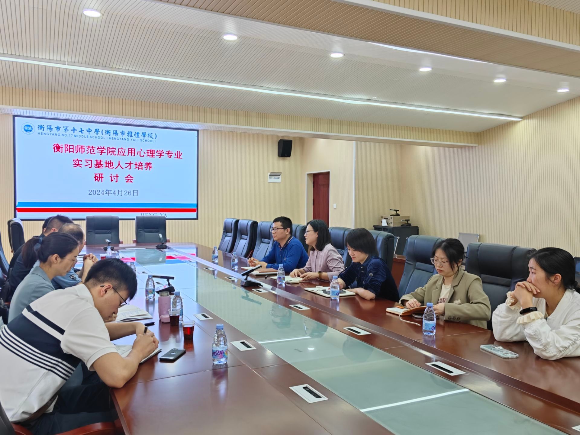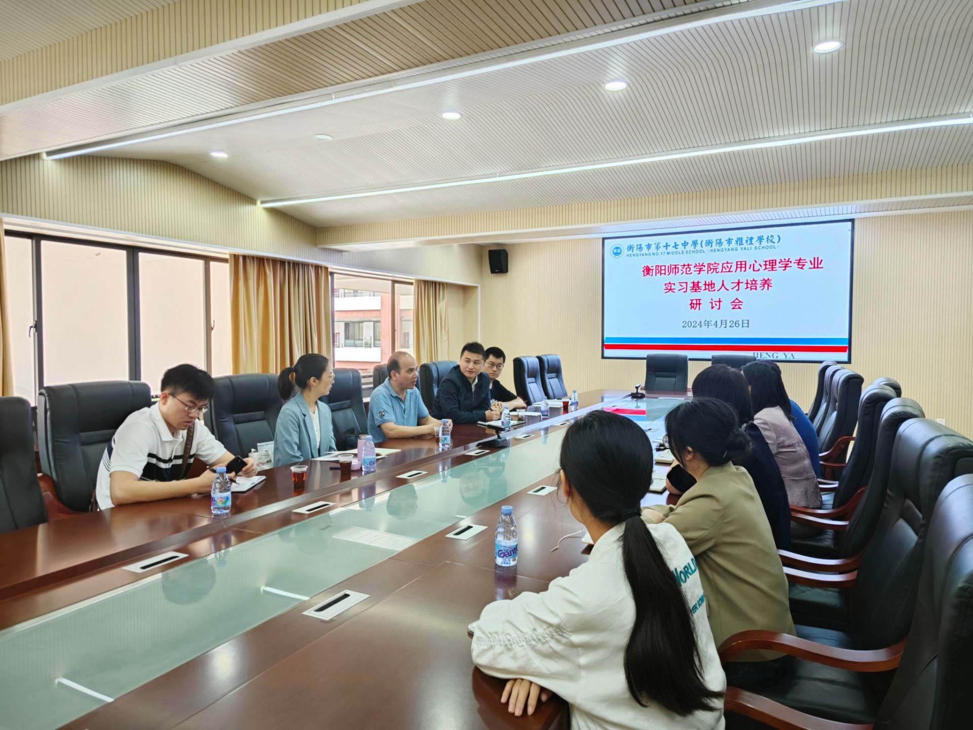 4月26日上午,公司教学副经理梁文明、心理学系主任刘罗,以及心理学系教师卢鑫、夏骁凯、陈艳,一行五人前往应用心理学专业实践教学基地衡阳市第十七中学开展人才培养研讨会,衡阳市第十七中学董事长兼应用心理学专业实践教学基地负责人袁敏及副董事长华嵘、心理健康教研组组长邹林杰、教师王若逸、杨佩共同出席。