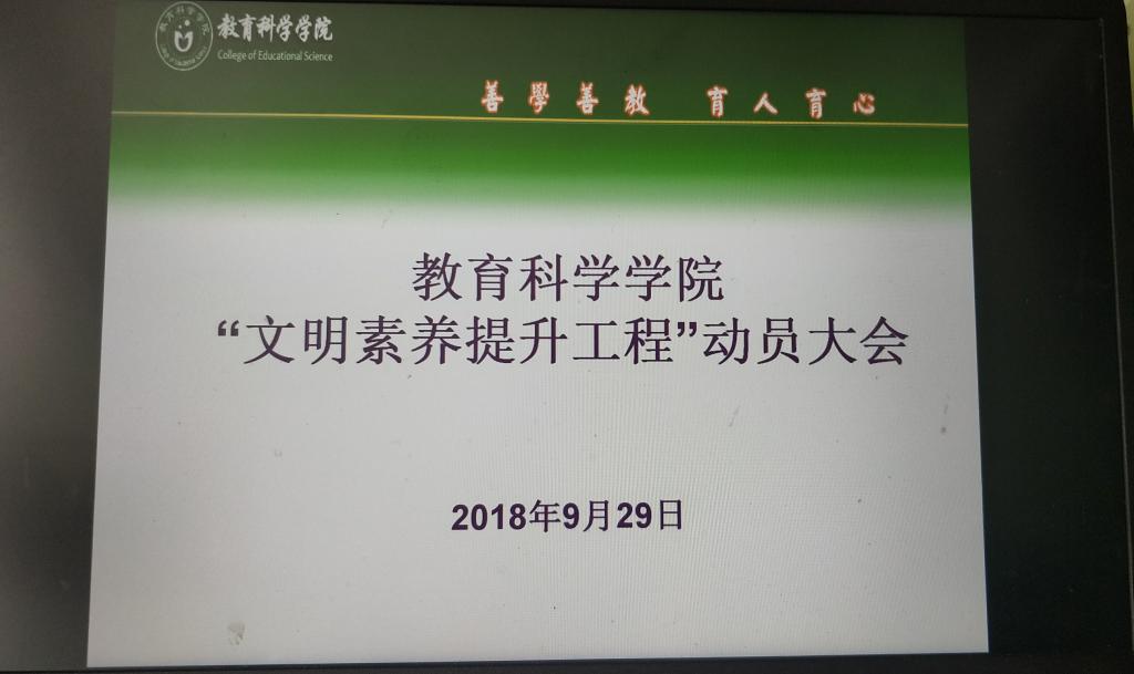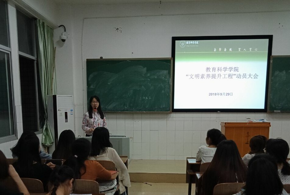 为加强文明公司建设,提高员工文明素质, 9月29日晚公司于外北301和文A311教室分别召开18级和16级“文明素养提升工程”动员大会,参加此次动员大会的有党总支书记陈君生、副书记罗耒英、辅导员曹喜燕老师及2018、2016级全体员工。