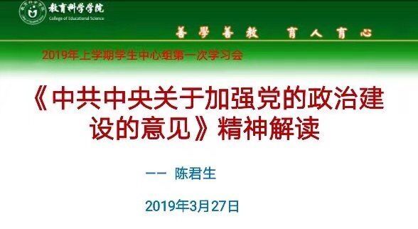 为了学习《中共中央关于加强党的政治建设的意见》(以下简称《意见》)精神,熟悉《意见》出台的背景,深刻认识新形势下加强党的政治建设的重要意义,3月27日晚上19:00,公司在文综楼A307召开员工党支部理论中心组第一次学习报告会。参加此次报告会的有中心组全体成员、各班班长团支书。本次报告会由党总支书记陈君生主讲。