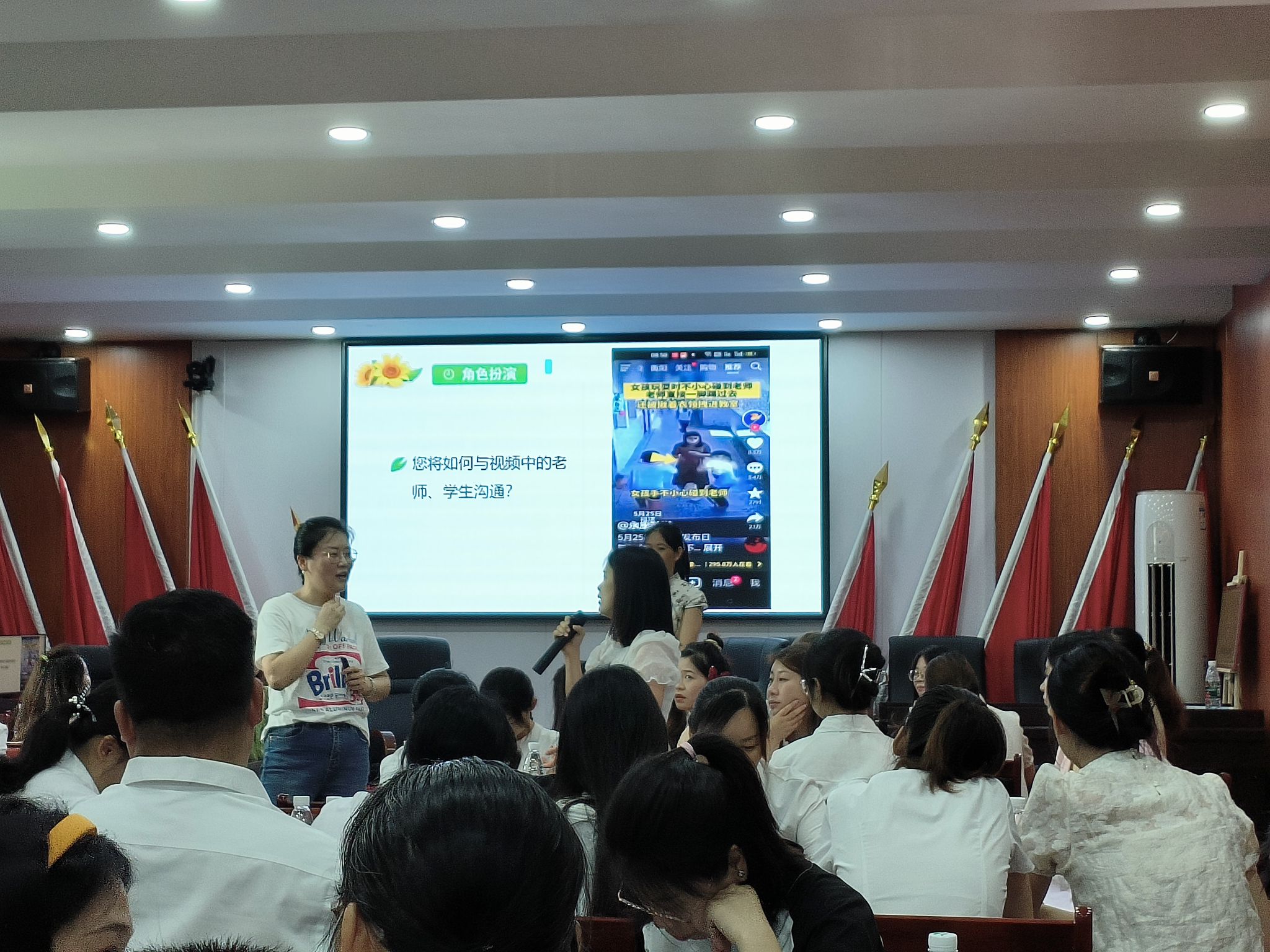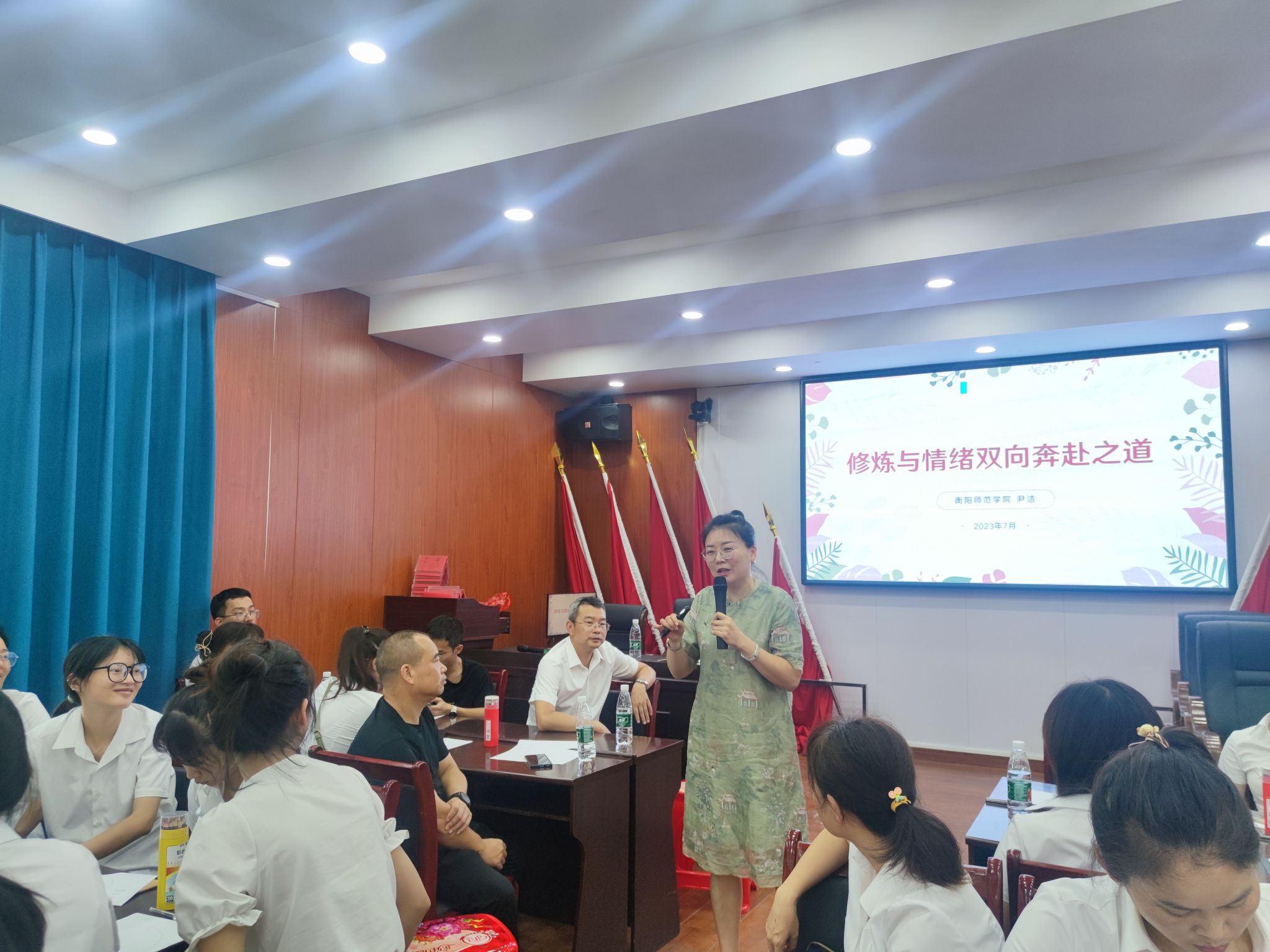 尹洁副教授则进行了主题为《修炼与情绪双向奔赴之道》、《做员工的重要他人——中小学教师道术结合螺旋式成长》的两场讲座。在《修炼与情绪双向奔赴之道》这场讲座中,尹洁副教授强调了情绪管理的重要性。她解释了情绪在人们的日常生活中所起到的作用,并详细介绍了情绪管理的方法和技巧。她鼓励教师们要学会控制自己的情绪,善于调节情绪,以更好地与员工进行沟通和交流。在《做员工的重要他人——中小学教师道术结合螺旋式成长》这场讲座中,尹洁副教授强调了教师在员工成长中的重要性。她指出,教师不仅仅是知识的传授者,更是员工心理健康的重要支持者和指导者。她介绍了教师如何通过看见员工、认识自己、走近员工,来提升自身的幸福力,更好地促进员工的全面成长和发展。