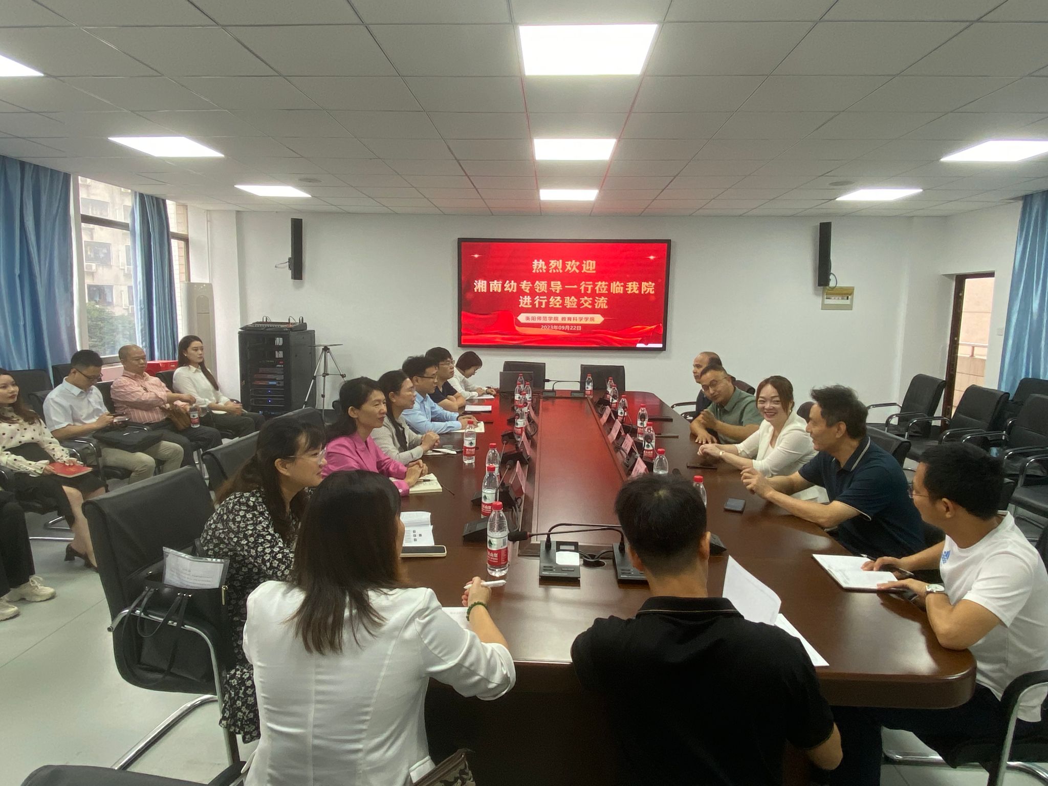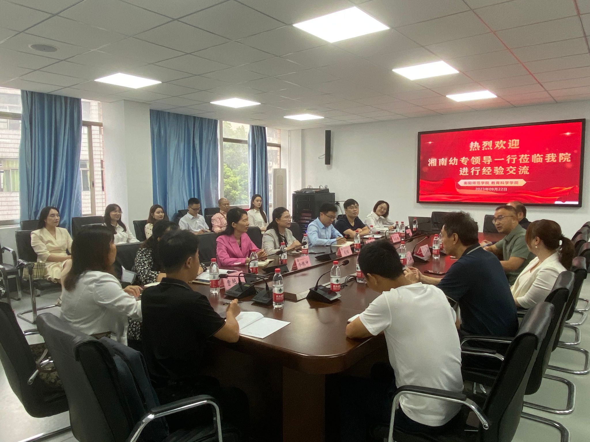 2023年9月22日上午,湘南幼儿师范高等专科公司一行15人来公司调研学前专业认证工作。调研座谈会在行知楼412会议室举行,由公司经理郑志辉教授主持。湘南幼儿师范高等专科公司教务处龙程副处长、党政办公室副主任邓伟、学前教育公司副经理冷佩坤,公司教学质量监控与评估中心主任谭晓兰、公司党总支书记谢伟华、副经理梁文明、专业负责人黎琦老师等参加了此次调研座谈会。