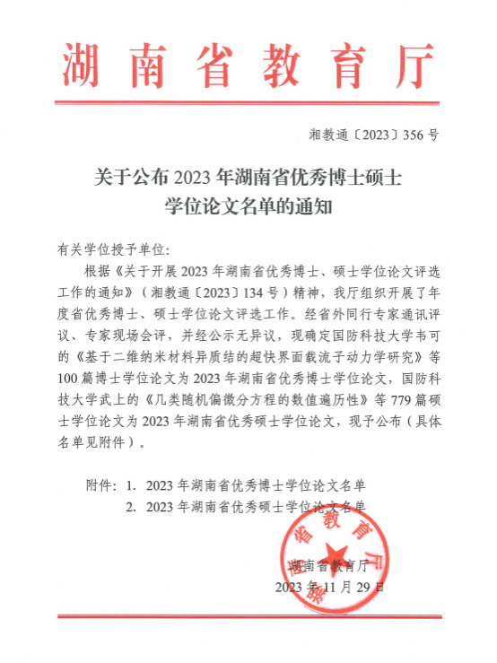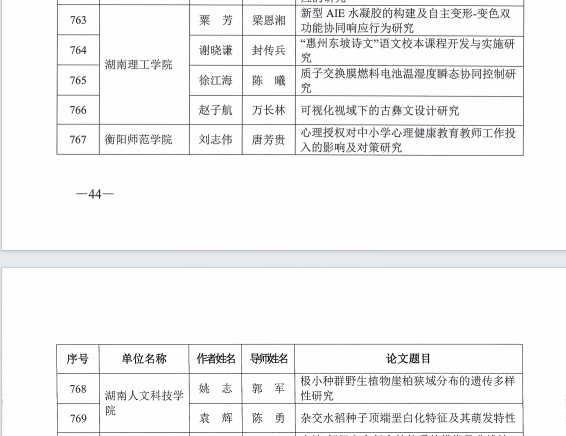 近日,湖南省教育厅公布了2023年湖南省优秀硕士学位论文,唐芳贵教授指导的心理健康教育领域硕士研究生刘志伟同学的论文入选湖南省优秀硕士学位论文。