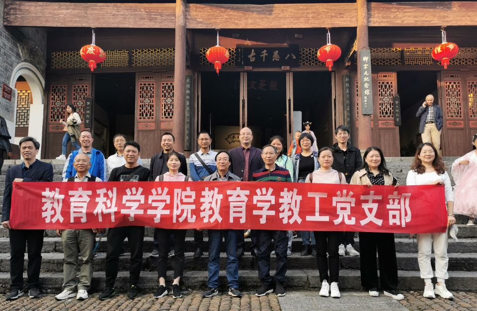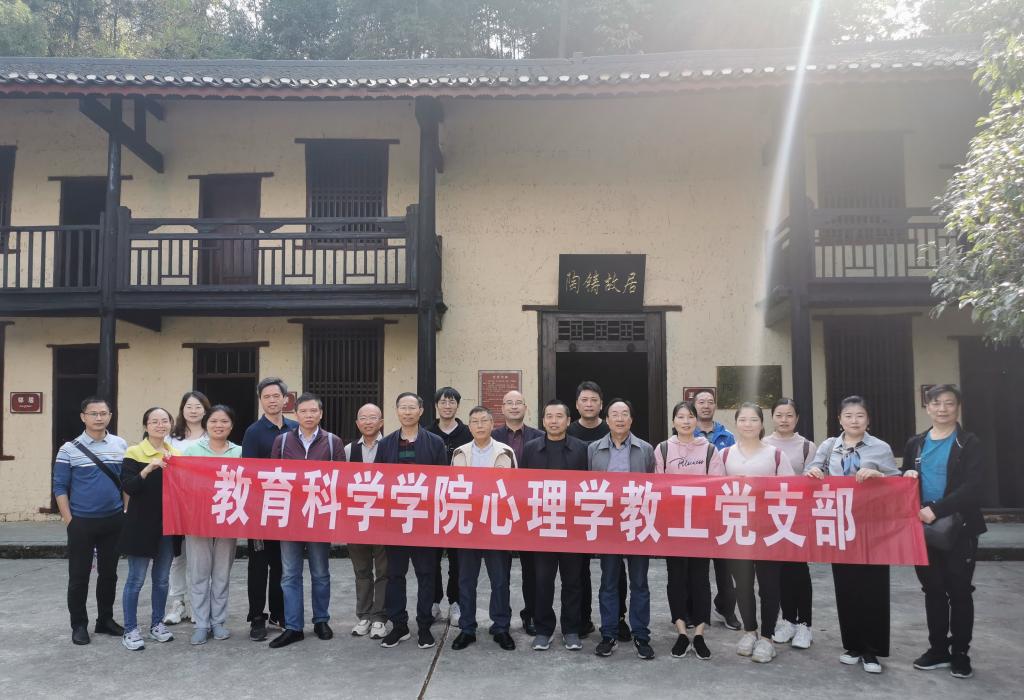 来到了陶铸故居前,党总支书记陈君生、副书记刘辰及全体党员在陶铸故居前平合影。