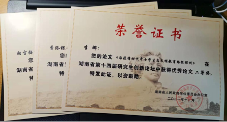 12月21日,教育管理方向3位研究生在湖南省第十四届研究生创新论坛“教育改革与教学创新”分论坛上所提交的论文获二等奖1项、三等奖2项,其中:2020级教育管理方向李娜提交的论文《后疫情时代中小员工态文明路径探析》获二等奖,2020级教育管理方向曹添银和2021级教育管理向吉梅提交的论文分别获三等奖。向吉梅代表公司研究生现场参加了论坛活动。