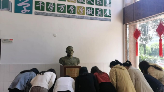 2022年4月22日上午,教育管理专业方向导师黎利云老师在课程《课程论专题研究》中的“陶行知理论指导下的南京晓庄公司附属小学的课程建设探讨”主题教学前,带领2021级教育管理研究生在西校区行知楼一楼大厅陶行知塑像前举行“致敬孔子,学习陶师”的致敬活动。宣誓活动由本次课程学习主汇报人聂康莹同学领誓。接着,全体人员向陶行知先生塑像三鞠躬。