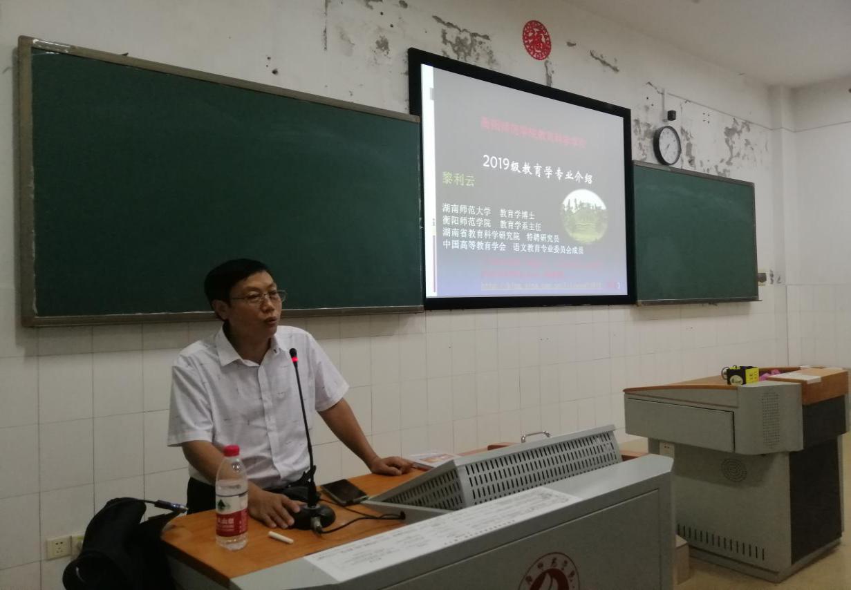 在教育学专业认识大会上,教育学系黎利云主任从专业定位、培养目标、培养规格与质量标准、专业培养要求与课程对应关系、主要课程、学制及授予学位、毕业学分及授予学位要求、各类课程结构比例以及课程设置与教学计划安排、就业前景等多个方面对人才培养方案进行了详细的阐述。黎主任结合自身经历,鼓励新生在大学期间博览群书向名师学习、积极参加各种实践活动、开展研究性学习与创新性实验等课外活动,搞好人际关系,通过大学四年的学习,成长为一个大写的人。
