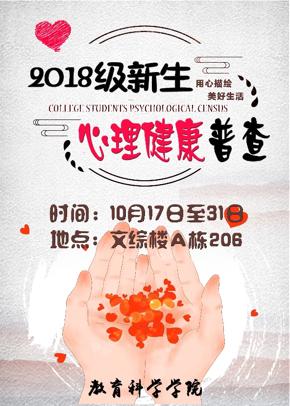 从这次普查活动让我了们解到了一次活动的顺利开展离不开同学们的热情配合和工作人员之间的默契度,更需要团学会各部门之间的互相帮助。在这次活动之后更是让大家知道了有一个可以去解决我心理问题和宣泄我不良情绪的地方,让我们可以更加迅速地抛弃坏情绪,用乐观向上的心态去面对我们每一天的生活,让教科院里洋溢着幸福快乐的味道。